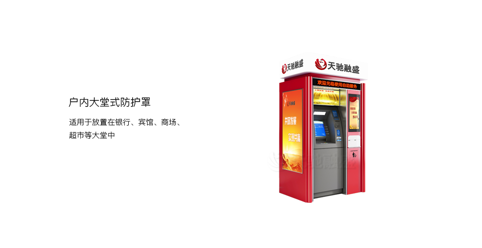 天驰融盛户内大堂式防护罩是专为大堂式ATM机而设计、开发、生产的,可放置在银行、宾馆、商场、超市等大堂中。