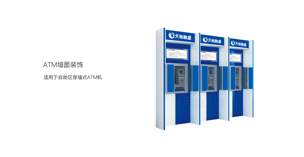 天驰融盛ATM墙面装饰是专为银行自助区装饰穿墙式ATM机而设计、开发、生产的,外形可根据金融机构需要及VI标准设计定制;装饰主体金属材质,表面采用静电吸附工艺技术并选用专业塑粉着色,防腐蚀、防生锈、抗氧化、防划防刻能力强。外观精美、颜色靓丽,标识位和广告位设计科学合理,视觉效果令人印象深刻,强化金融机构品牌形象。根据现场环境和尺寸加工生产,保证与ATM之间完美契合。