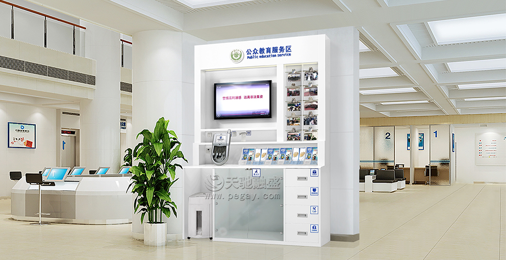 天驰融盛公众教育服务区风格优美、高贵典雅,结构紧密,利用率高,使用灵活,主要由白色烤漆、环保型、高密度、精良的板材和钢化磨砂玻璃拼制而成。外形可根据摆放及展示物品多少、大小、规格、重量及各自特点,做成标准型或订制型,让功能区域划分及构造的容量得到最大利用,满足银行个性化需求。